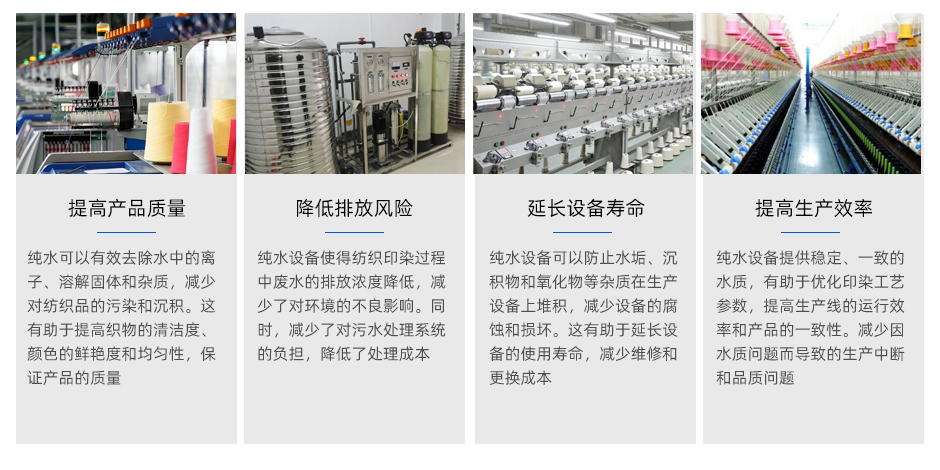 紡織印染行業(yè)使用純水設(shè)備可以有效去除水中的離子、溶解固體和雜質(zhì),減少對紡織品的污染和沉積。這有助于提高織物的清潔度、顏色的鮮艷度和均勻性,保證產(chǎn)品的質(zhì)量