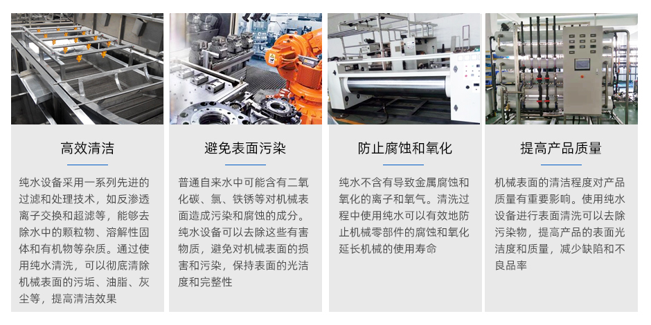 機械表面清洗使用純水設(shè)備可以有效地去除機械表面上的污染物、避免二次污染,延長機器的使用壽命,符合環(huán)保要求,并且降低操作成本