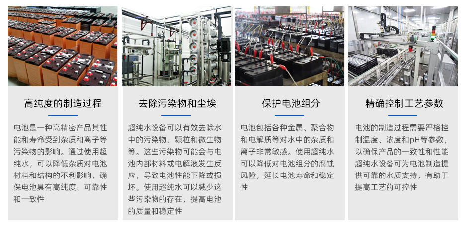 超純水設(shè)備可以提供高純度的水質(zhì),用于電池的制造過程。電池是一種高精密產(chǎn)品,其性能和壽命受到雜質(zhì)和離子等污染物的影響。通過使用超純水,可以降低雜質(zhì)對(duì)電池材料和結(jié)構(gòu)的不利影響,確保電池具有高純度、可靠性和一致性