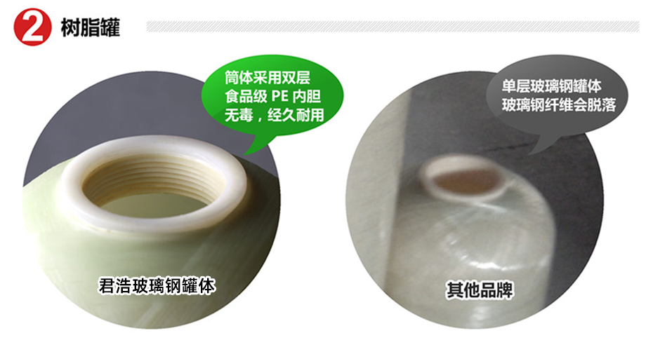 提示:單層玻璃鋼罐體,時間使用久了玻璃鋼纖維會脫落到水中,后果不堪設(shè)想,君浩采用雙層樹脂罐體,內(nèi)襯食品級PE內(nèi)膽,衛(wèi)生無毒,罐體壽命可達(dá)15年