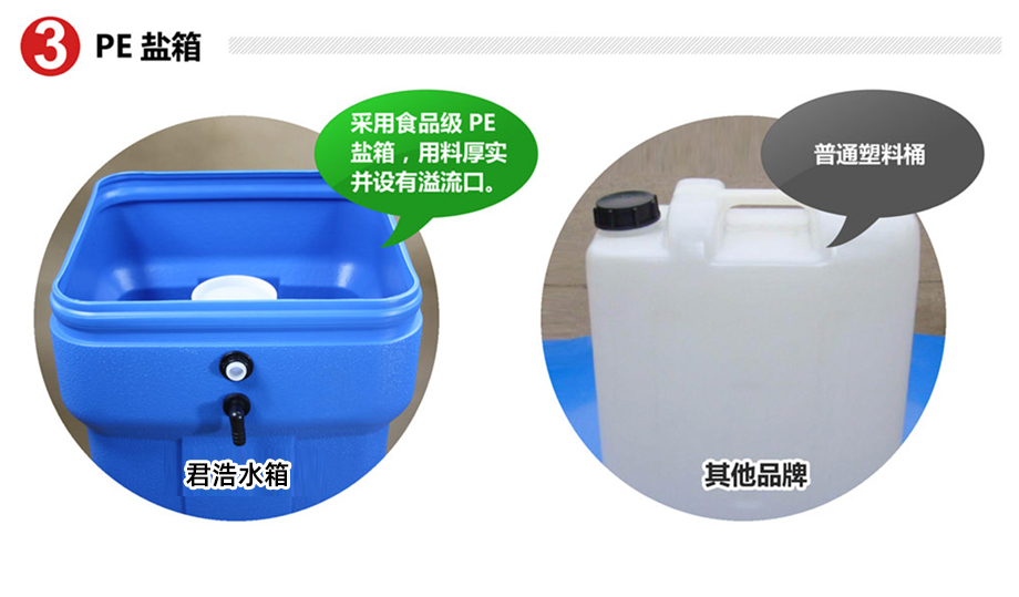 提示:君浩鹽箱采用食品級PE,并設(shè)有儲鹽隔板、鹽井、溢流口讓樹脂再生效果更好